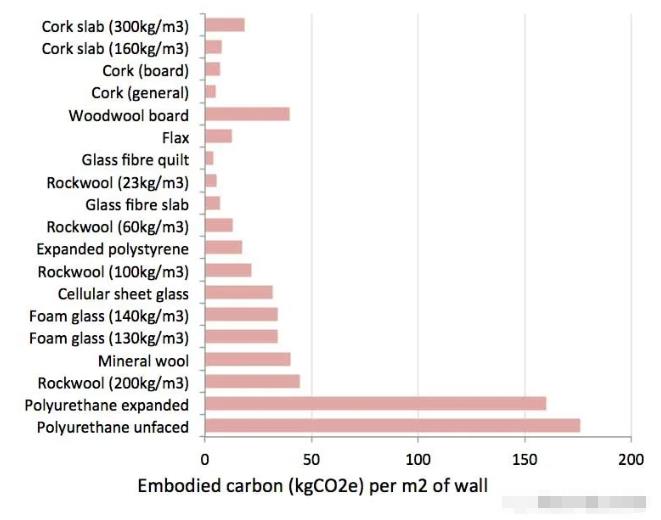 上面的表圖,但從厚度角度,肯定是厚度越厚,體積越大。我們下面來(lái)對(duì)比材料的隱含碳排放。隱含碳是指任何一種產(chǎn)品的生產(chǎn),都會(huì)直接或間接地產(chǎn)生碳排放,為了得到某種產(chǎn)品,而在整個(gè)生產(chǎn)鏈中所排放的二氧化碳。那么,越是那些化工產(chǎn)品,可能經(jīng)過(guò)了很多工藝,引起的隱含碳就越高。越是依靠天然材料就能加工制作的材料,其隱含碳就越少。下面這個(gè)就是各種保溫材料的隱含碳對(duì)比